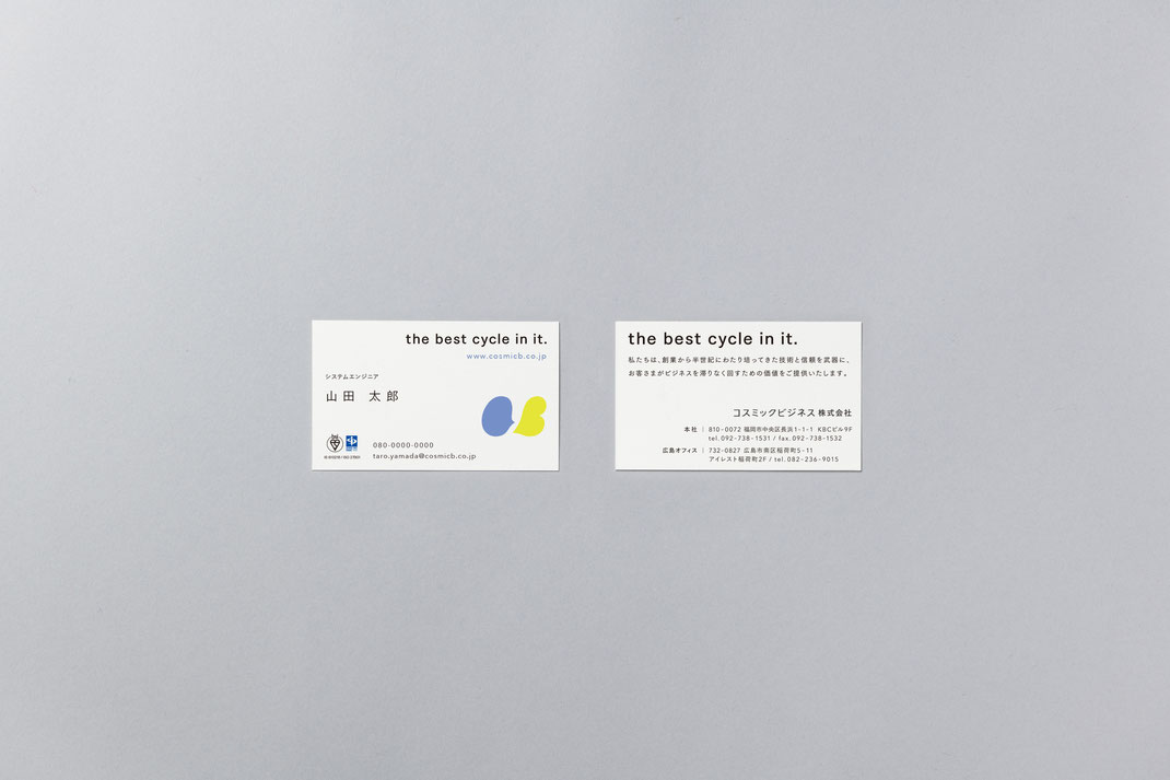固いイメージのあるシステム会社をやわらかく表現し、対外的な印象と同時に従業員エンゲージメントや採用マッチ率の向上にも貢献しています。左の「C」はコスミックビジネスを、右の「B」は顧客を表しています。